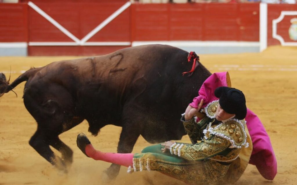 O jovem espada foi colhido por um novilho de Conde de Mayalde, sofrendo uma cornada na região inguinal de cerca de 10 centímetros.