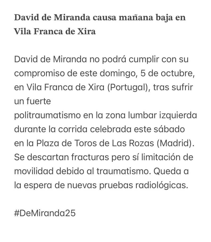 O anúncio foi feito pelo próprio toureiro nas suas redes sociais. David Miranda causa baixa em Vila Franca de Xira, na corrida mista com que se inauguraria a Feira Taurina de Outubro na referida localidade portuguesa.